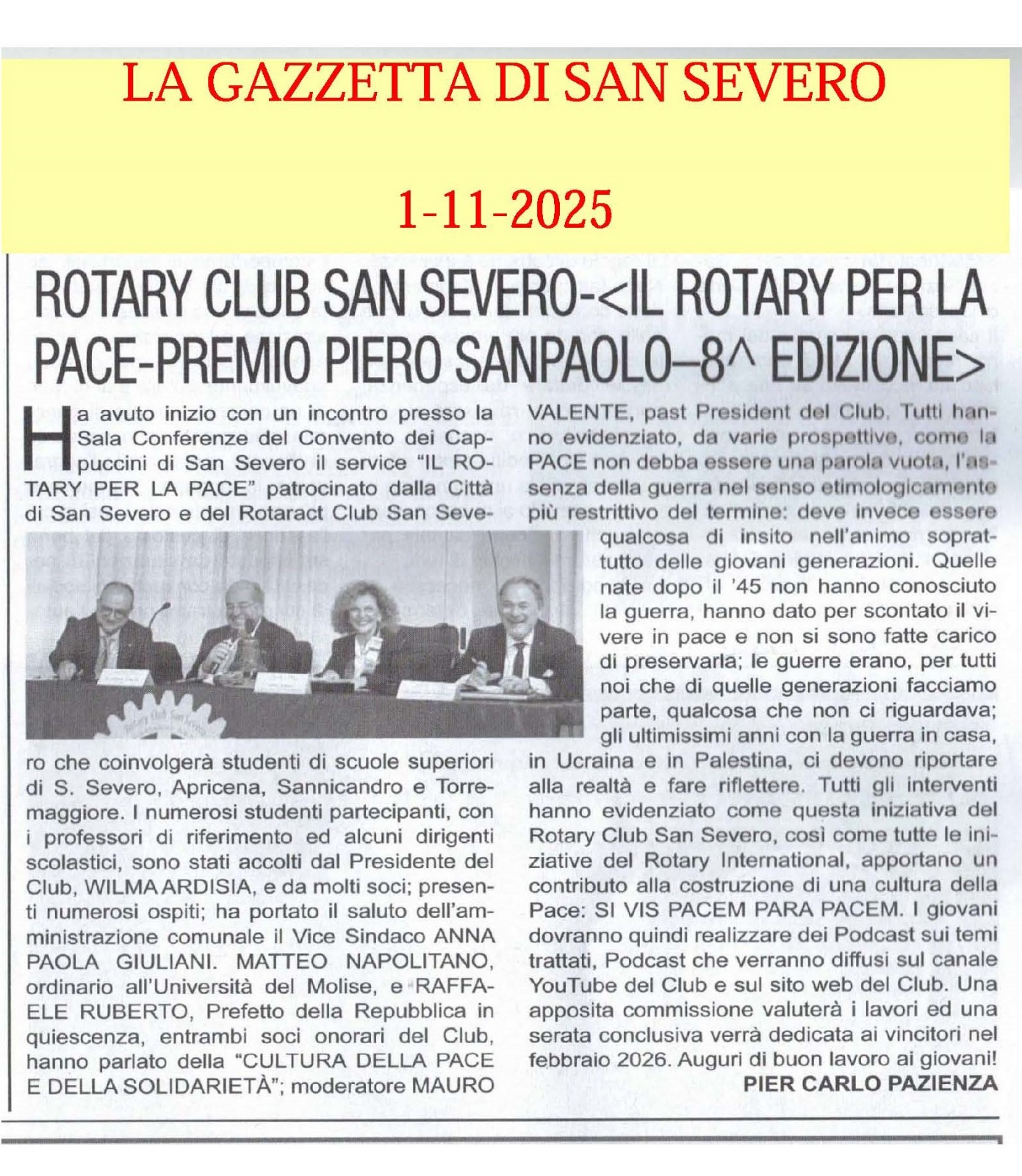 Ha avuto inizio con un incontro presso la Sala Conferenze del Convento dei Cappuccini di San Severo il service "IL ROTARY PER LA PACE", patrocinato dalla Città di San Severo e del Rotaract Club San Severo che coinvolgerà studenti di scuole superiori di S. Severo, Apricena, Sannicandro e Torremaggiore.