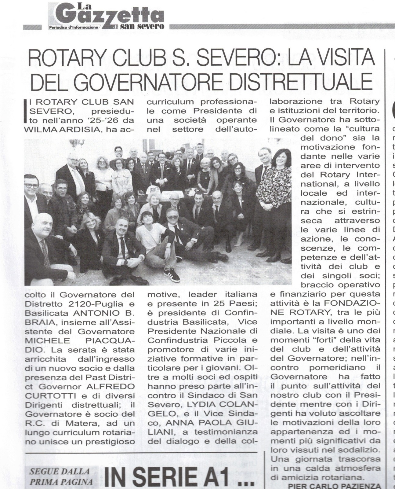 Il ROTARY CLUB SAN SEVERO, presieduto nell'anno '25-'26 da WILMIA ARDISIA, ha accolto il Governatore del Distretto 2120-Puglia e Basilicata ANTONIO B. BRAIA, insieme all'Assistente del Governatore MICHELE PIACQUADIO.